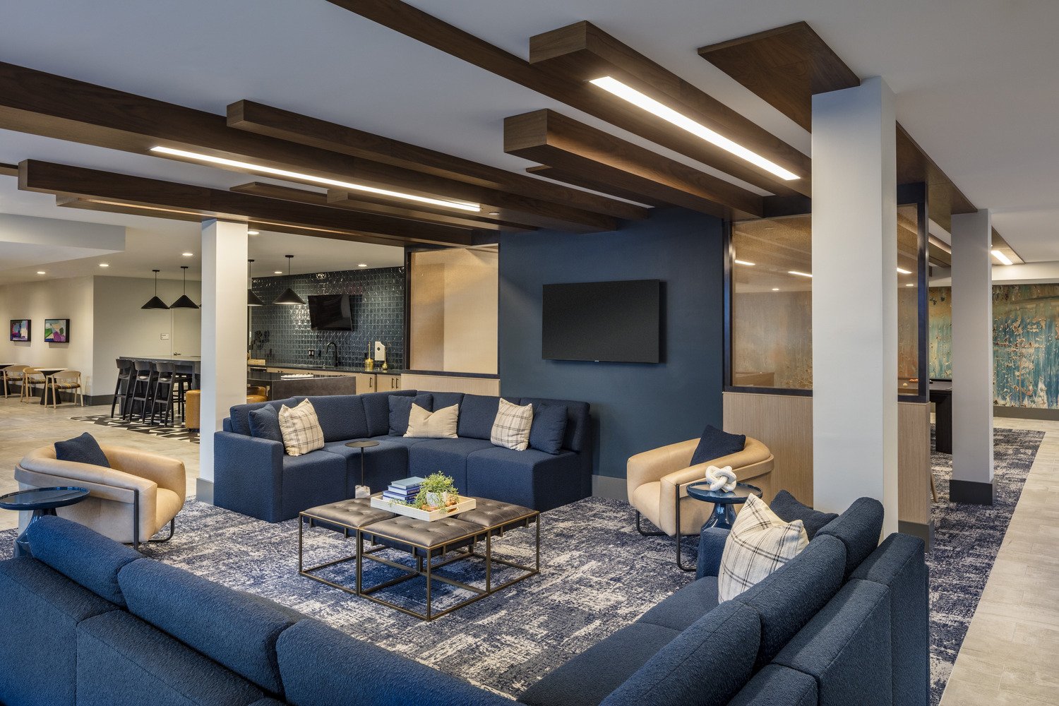 Throughout the building, the interior design reinforces a sense of tranquility through soft tones, layered textures, and warm lighting. The overall aesthetic bridges the transition between campus living and multifamily housing, creating a space that feels mature yet approachable. Certified Fitwel, Rambler Atlanta integrates healthy design principles with urban efficiency through features such as daylight-filled corridors, a green roof that manages stormwater, and enhanced acoustic comfort in units and common areas.