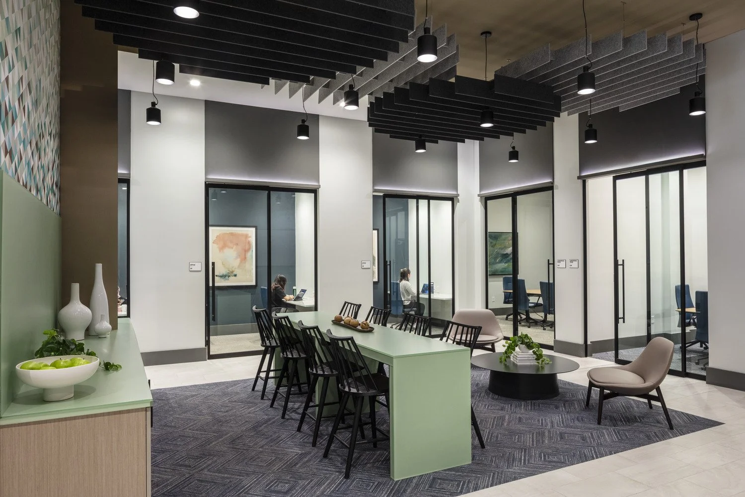 From the outside, the 19-story tower is defined by a façade of interlocking light and dark volumes that add depth and rhythm to Midtown’s skyline. Behind this carefully crafted rhythm is an efficient construction process that used prefabricated acrylic panels to achieve variation and quality while allowing the building to be completed ahead of schedule