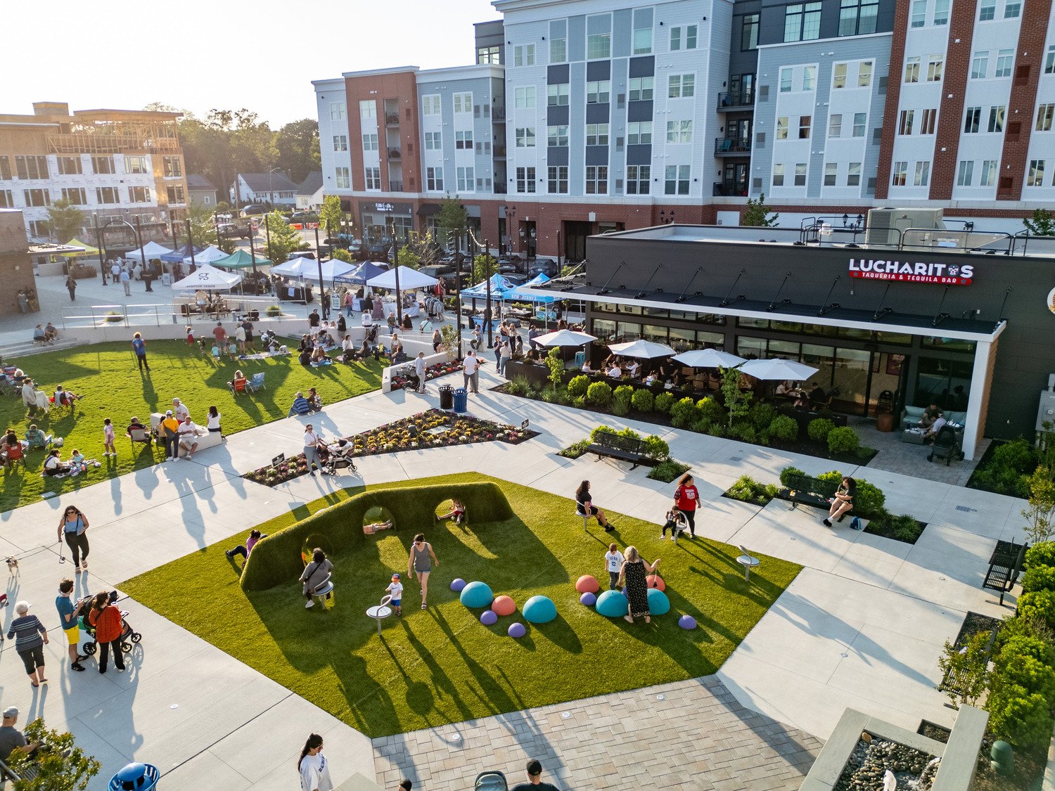 But what truly sets The Core apart is how private life flows naturally into the public realm. Restaurants, breweries, and specialty shops open directly onto the plaza, creating a pedestrian-friendly environment that draws more than 15,000 weekly visitors. Signature events have become a hallmark of the district: the “Grooves on the Green” music series, family movie nights, seasonal holiday markets, and community celebrations such as “Halfway to Station Paddy’s Day” regularly attract thousands. Cell phone data shows traffic to the site has grown fivefold in just a year, underscoring its role as a destination.