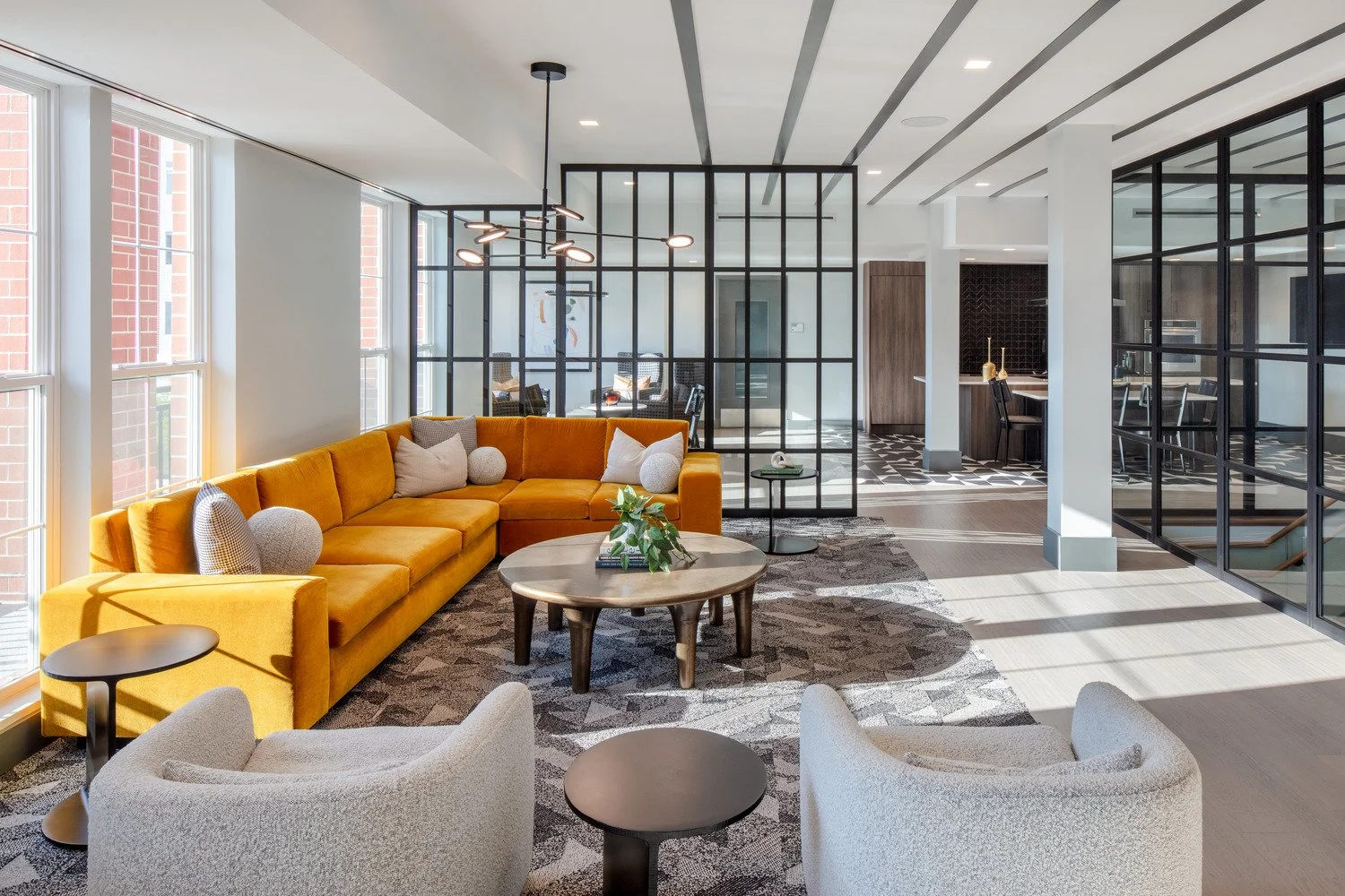 The Core delivers 388 apartments within four buildings arranged around this central plaza, which has quickly become the heart of the Station Yards district. Homes feature open layouts and large windows that frame views of landscaped courtyards or the active square. Just above the main lobby, residents have access to a suite of amenities including a co-working lounge, clubroom, wellness studios, and a demonstration kitchen for community events. Outdoor courtyards, fire pits, and a rooftop terrace extend daily life into the open air, blending comfort with connection.