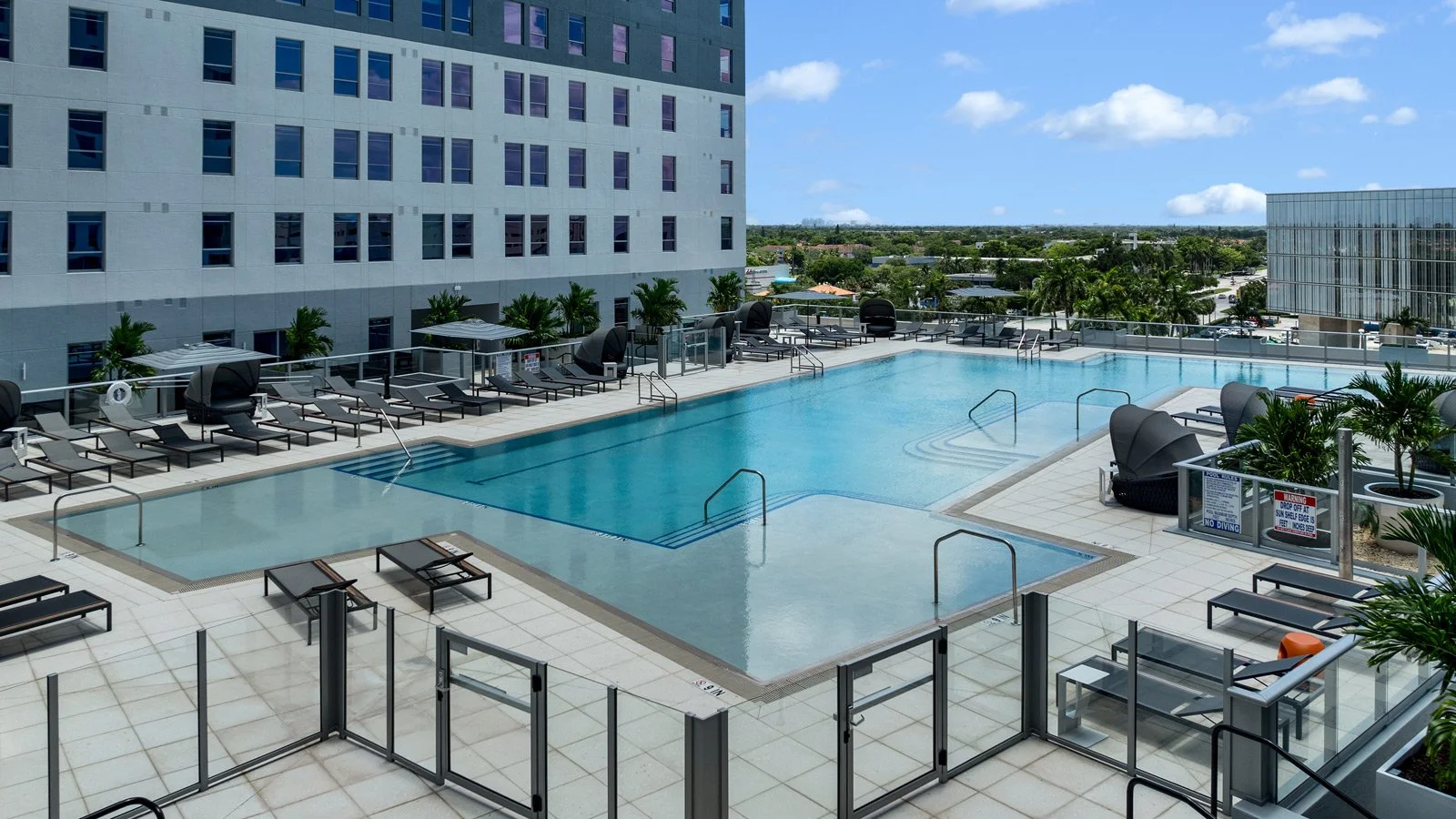 - Leasing, fitness center, club room, 40K sf amenity deck with resort-style pool and outdoor kitchen, roof top dog run, pet spa, ample study space, and rooftop terrace with views of Miami and the FIU campus